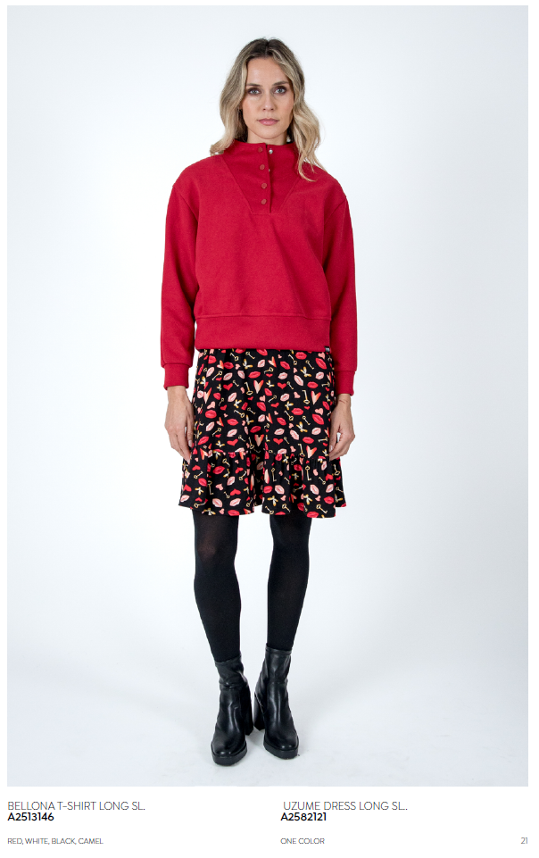 Sudadera original y moderna con cuello que se cierra con clips. Disponible en rojo y blanco. Tacto muy suave y confortable. Composición : 73% algodón , 23% poliéster y 4% elastano.