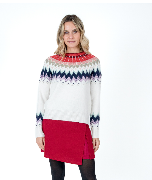 Jersey de punto con dibujo estilo nórdico . Fondo blanco y dibujos en cuello y puños en tonos rojos , granate, verde ,rosa , negro y malva. Cuello redondo y ligeramente elevado. Composición : 75% poliéster, 10% acrílico, 10% poliamida y 5% lana. Abrigado y dulce al tacto.