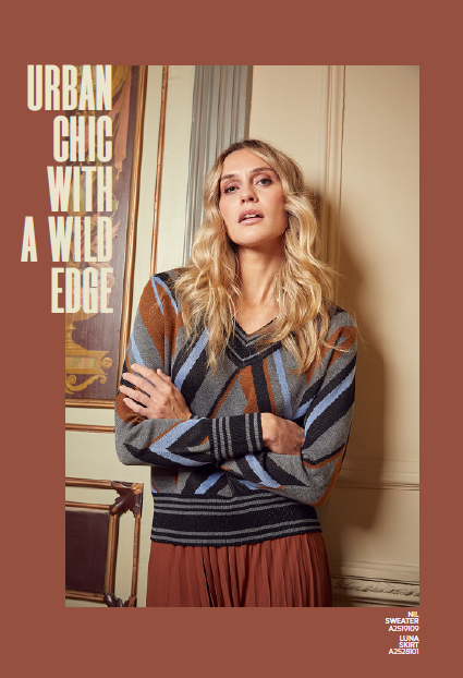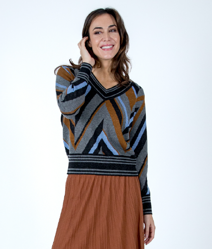 Jersey de punto con cuello de pico en tonos beige , negro , camel y azul claro , con un brillito sutil que lo hace muy elegante y original al mismo tiempo. Con escote ,puños y bajos acabados en negro y beige rallado. Composición : 52% poliéster, 19% acrílico ,18% poliamida ,6% lana y 5% fibra metálica.