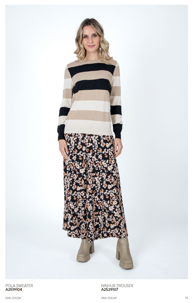 Jersey de punto fino a rayas en tonos crudo , beige y negro . Suave y confortable, realizado en un 80% de punto de viscosa y 20% poliamida.