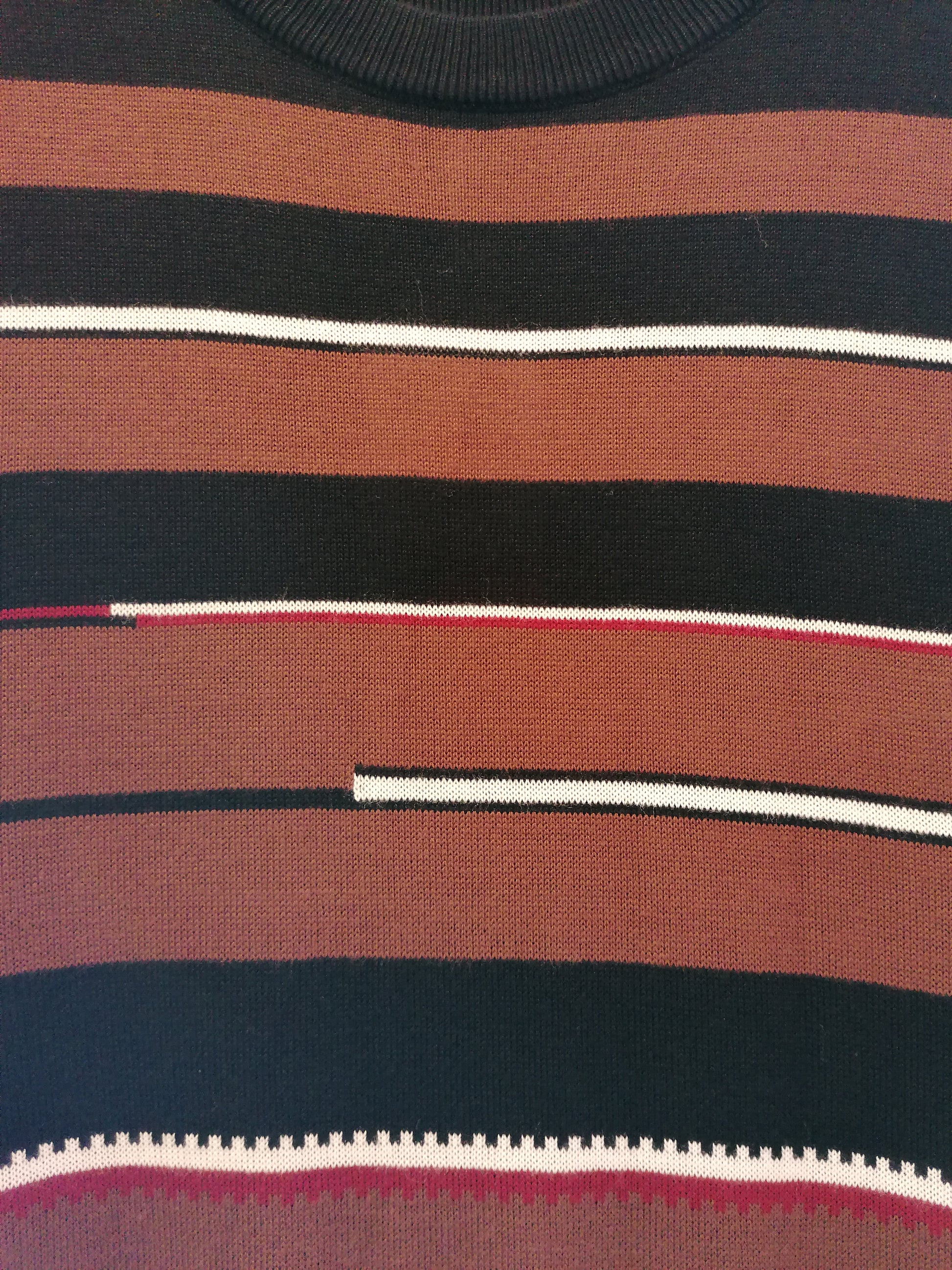 Jersey en punto fino ( 80% viscosa y 20% poliamida ) a rayas entonos negro , marrón , blanco y granate. Tacto suave y muy agradable.