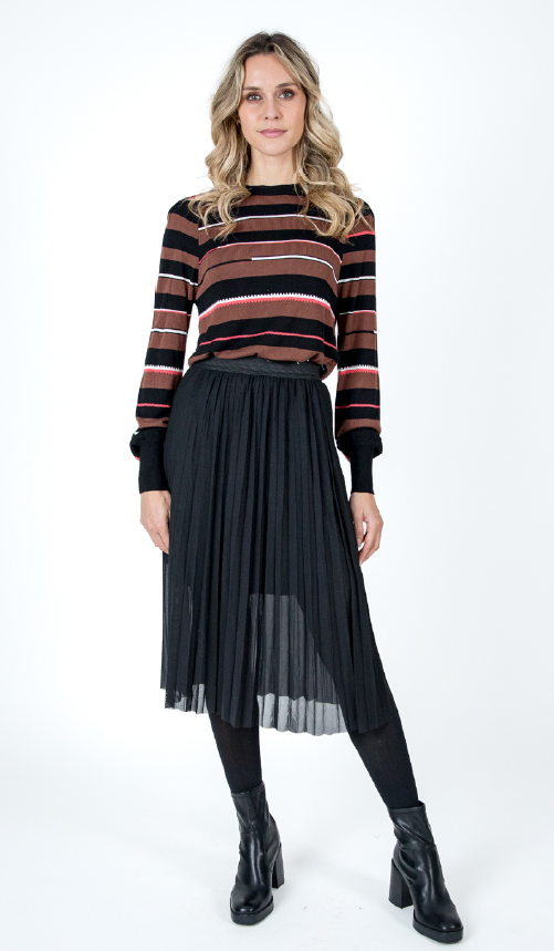 Falda midi de redecilla plisada , con forro interior en punto fino , muy ligera y con muy buena caída. Muy versátil . Para todo tipo de ocasión. Composición : 95% poliéster y 5% elastano. Puedes usarla a lo largo de todo el año.