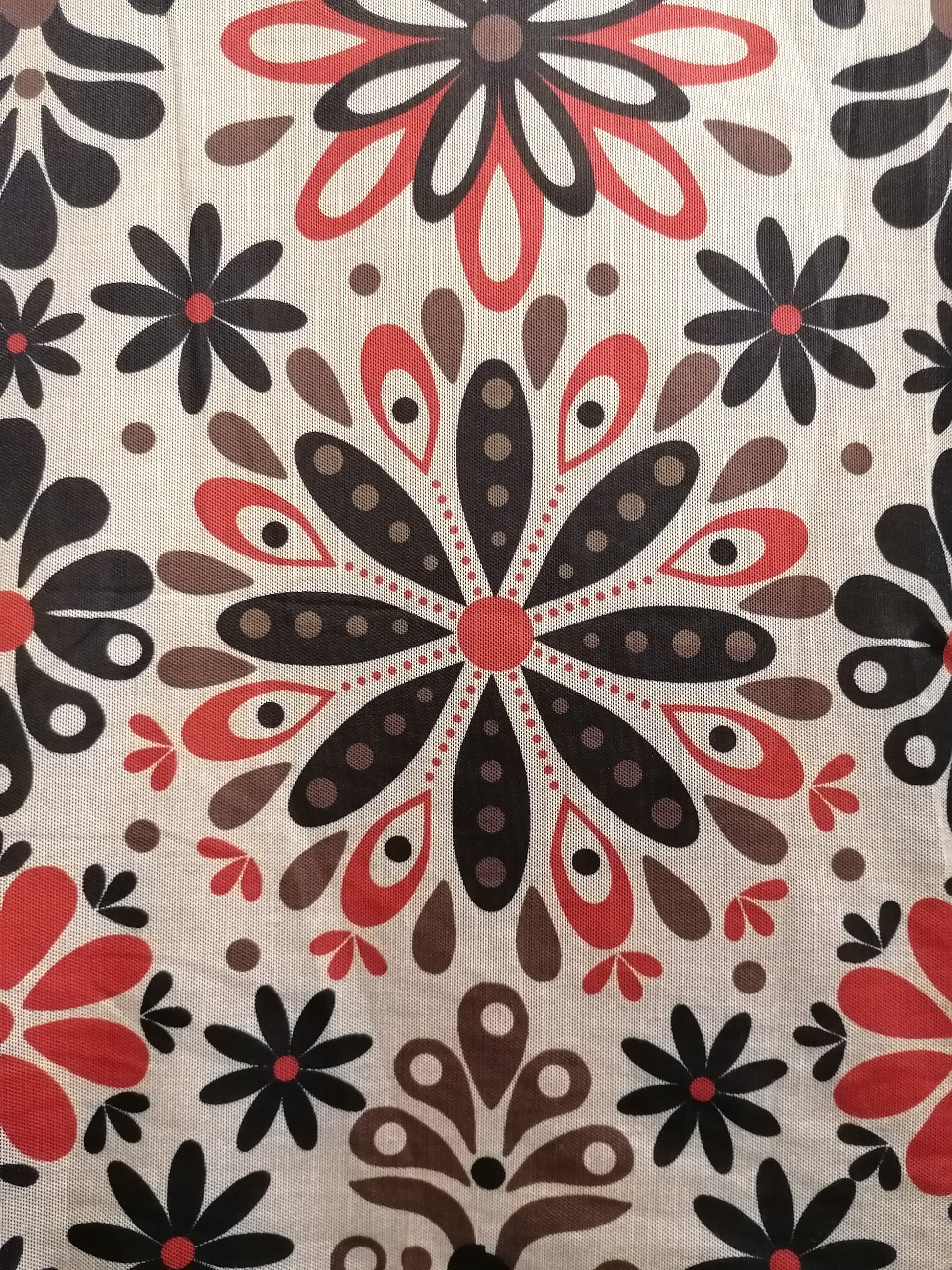 Camiseta de redecilla con forro y mangas semitransparentes en estampado floral "pop". Con una costura transversal con fruncido , que hace de esta camiseta un modelo muy original. Composición : 95% poliéster y 5% elastano.