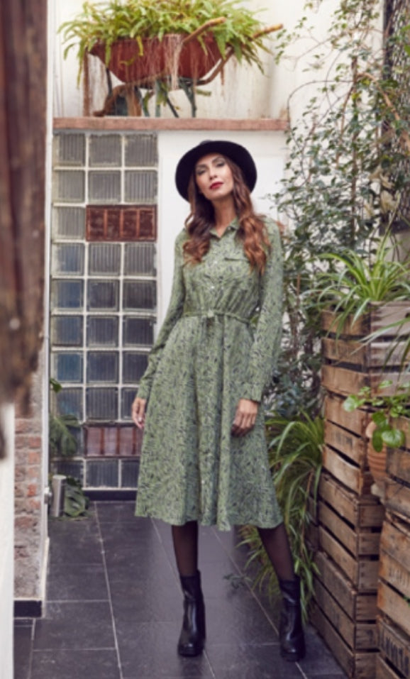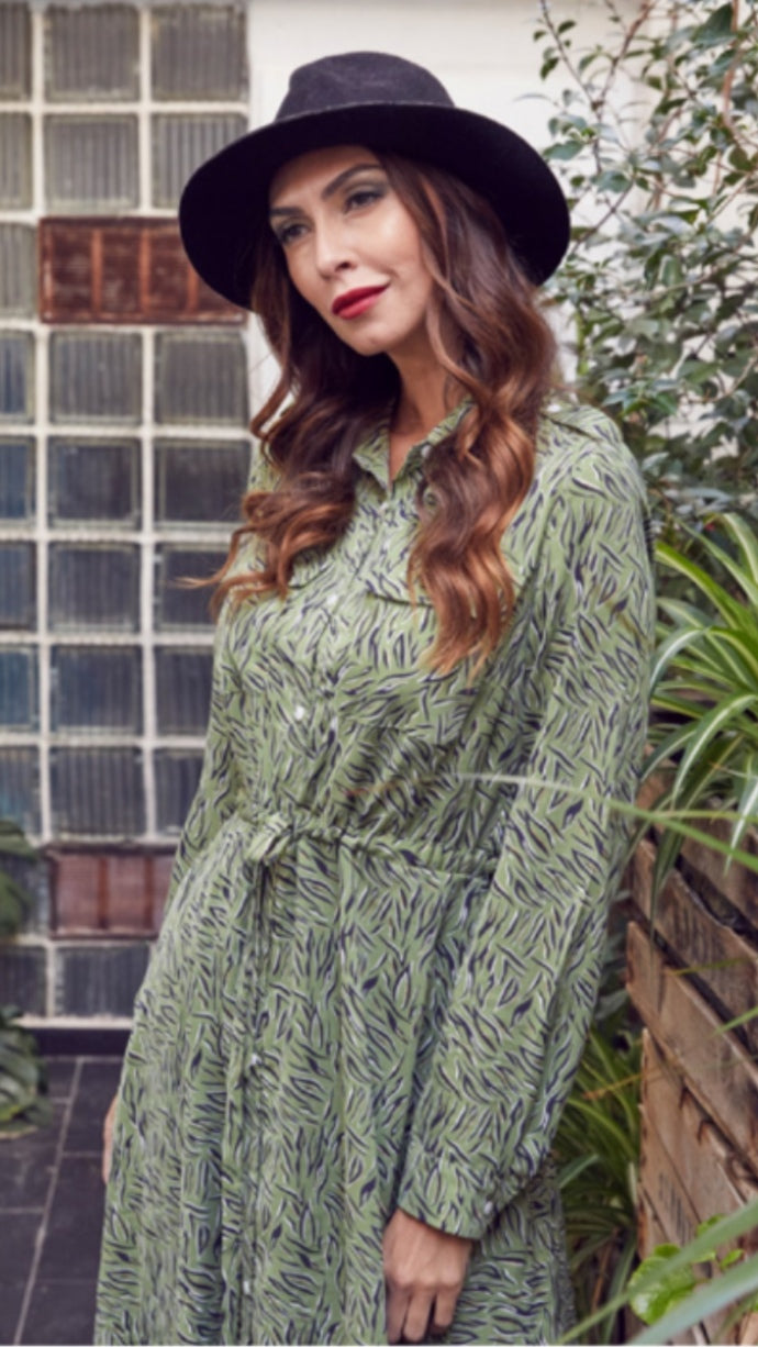 Vestido camisero largo en poliéster con estampado verde con dibujos estilo "animal print" en negro con brillos dorados. Entallado en la cintura , es un modelo que estiliza y elegante.
