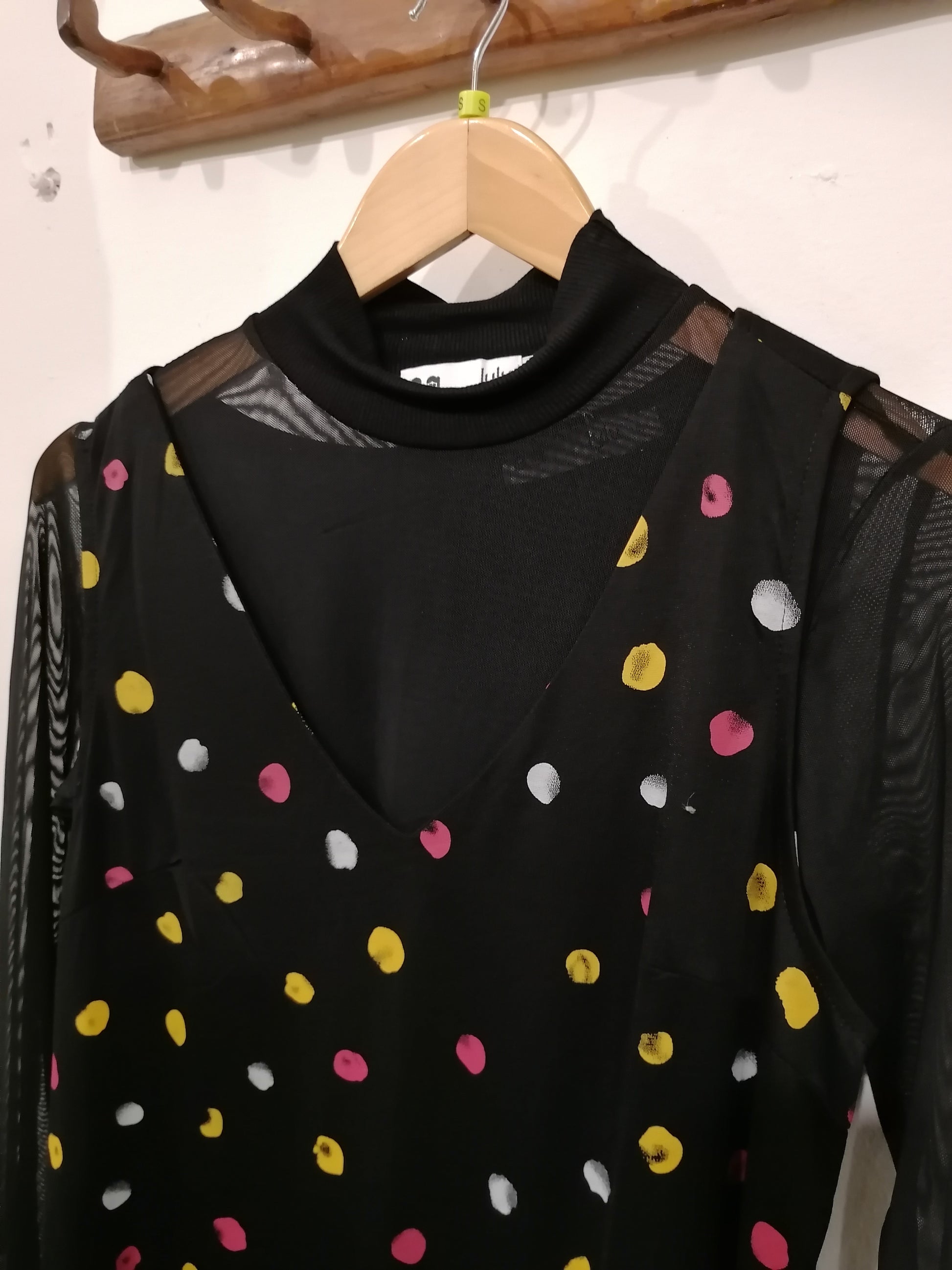 Vestido que consta de 2 piezas, la camiseta negra semitransparente , como de redecilla con cuello de canalé, y el vestido pichi con topos irregulares de colores sobre fondo negro. Composición : 45% algodón , 29% poliéster, 20% poliamida y 6% elastano.